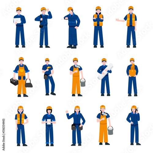 industrial male and female construction and character building workers various poses