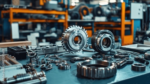 metal, part, tool, industrial, workbench, factory, workshop, manufacturing, gear, cog, machinery, equipment, production, engineering, technology, steel, chrome, silver, shiny, grey, blue, surface, background, detail, sharpened, blur, light, shadow, texture, design, assembly, machine, operation, process