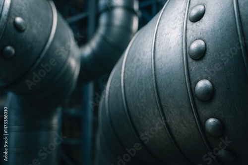 Industrial metal pipe with rivets in power plant machinery close up with shallow depth of field for industrial concept