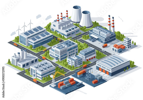 Industrial park with various buildings, renewable energy sources, and shipping containers
