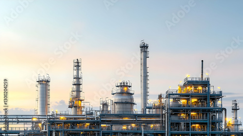 Industrial Plant Complex Against Evening Sky Showing Illuminated Structures Pipelines and Chimneys