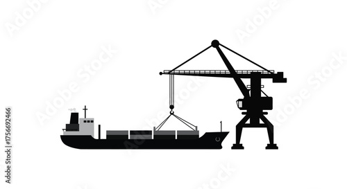 silhouette, port, harbor, cargo ship, container ship, crane, loading, unloading, industrial, maritime, shipping, logistic, transportation, heavy machinery, dock, waterfront, export, import, trade, commerce, industry, work, operation, machinery, equipment, engineering, construction, infrastructure, global, international, delivery, warehouse, storage, vessel, boat, sea, ocean, sky, white background, minimalist, graphic, icon, vector, outline, black-and-white, contrast