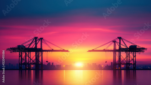 Industrial port scene with vibrant cranes silhouetted against stunning sunset, creating dramatic skyline. colors blend beautifully, evoking sense of tranquility and awe