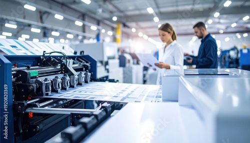 presser, industrial, factory, manufacturing, production, machine, print, paper, sheet, process, men at work, technician, man, woman, quality control, inspection, commercial, modern, industry, workshop, equipment, machinery, technology, automation, workflow, engineering, workspace, business, publishing, graphic design, print shop, employee, digital, offset, professional, supervision, efficiency, sharpened, skilled, labor, bright, indoor, teamwork, productivity