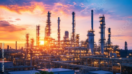 Industrial Refinery Silhouetted Against a Vibrant Sunset Sky