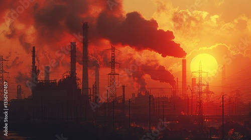 Industrial refinery with smog filled orange toned sky. Pollution. Climate change. Toxic chemicals. Factory smoke stacks billowing fumes. Global warming.
