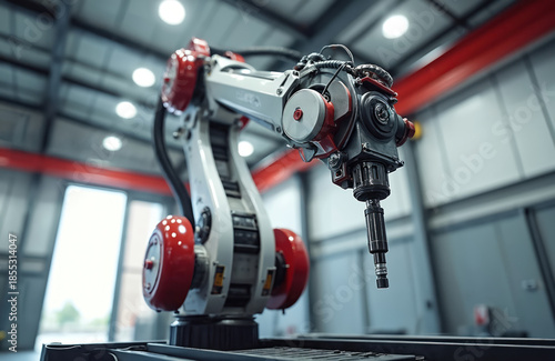 Industrial robot arm works in factory. Automated machine part for production line. Precision machinery in manufacturing setting. Advanced tech equipment. Heavy industry. Futuristic. Red and white.