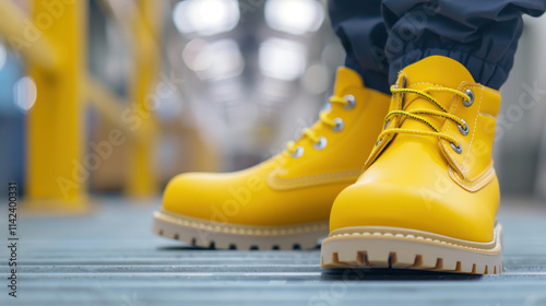 Industrial safety footwear innovation. Vibrant yellow protective shoes engineered for maximum workplace defense against chemical and environmental hazards in professional settings.