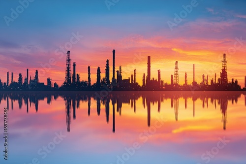 Industrial skyline reflected on tranquil water at sunset