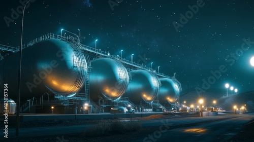 Industrial storage tanks at night with bright lights and starry sky. A serene yet powerful scene of energy production.