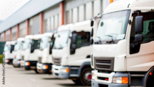 Industrial Truck Fleet: Soft-focus image of cargo trucks outside a factory.