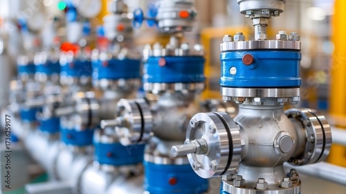 Industrial valves in a factory setting. Metallic valves with blue accents are aligned in a row. The background shows blurred machinery and equipment.