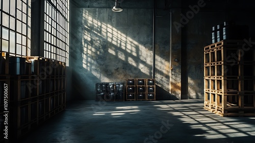 warehouse, industrial, sunlight, shadow, barrel, pallet, wood, concrete, floor, light, dark, room, interior, grunge, texture, storage, container, stacked, building, factory, metal, window, pane, glasses, beam, dusty, aged, old, empty, space, atmosphere, mood, grey, brown, dim, quiet, solitude, stillness