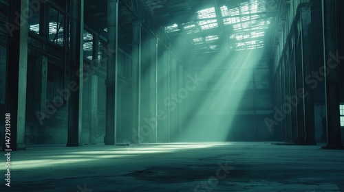 Industrial warehouse with concrete floors and steel beams, showcasing raw urban aesthetics and depth.