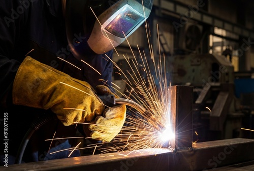 Industrial welder with protective mask and gloves working on metal with bright sparks