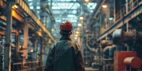 Industrial worker in a hard hat, observing machinery in a manufacturing factory, highlighting industrial work environments.