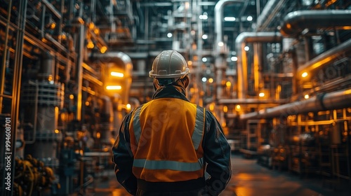 Industrial Worker in Safety Gear Inspecting Modern Factory with Complex Machinery and Piping Systems