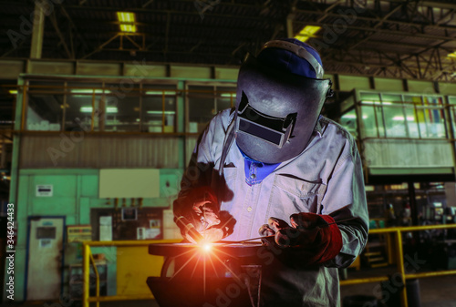 Industrial Worker process laborer by tig weld torch at the factory welding steel structure.