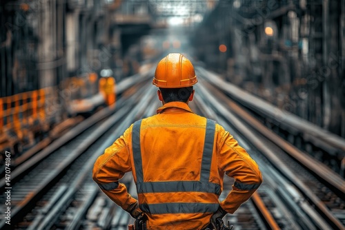 Industrial worker stands thoughtfully on railway tracks.