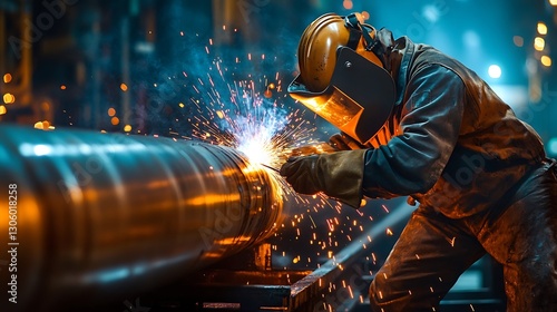 Industrial Worker Welding Metal Pipe with Safety Gear and Sparks Flying