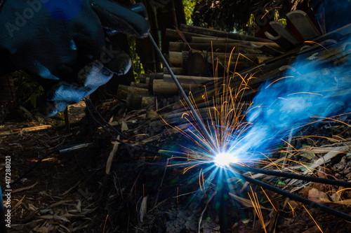 Industrial workers at a close-up welding plant