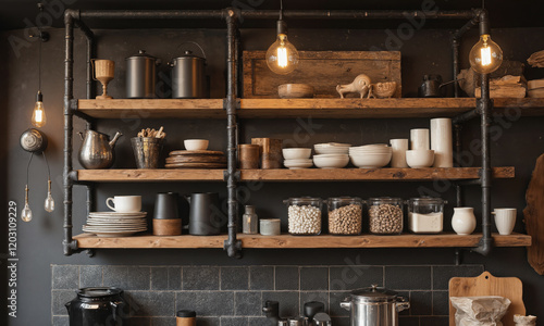Industrial-style open shelving made from dark metal pipes and reclaimed wood, displaying neatly arranged kitchenware and rustic decorative items. Soft,
