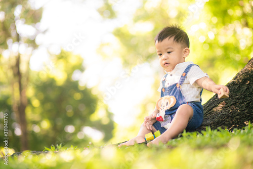 Infant asian baby boy sitting in city park sunny day under tree