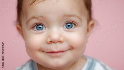 Infant with bright blue eyes and a gentle smile on a soft pink background, capturing an endearing and cheerful expression, suitable for family themes and childhood concepts.