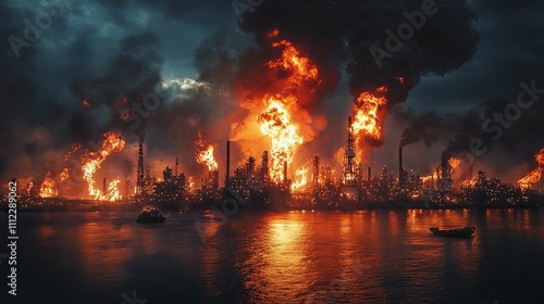 inferno, refinery, fire, flames, smoke, industrial, complex, blaze, catastrophy, disaster, emergency, burning, destruction, explosion, accident, hazard, danger, risk, pollution, environmental, devastation, chaos, calamity, crisis, tragedy, loss, damage, impact, consequence, fallout, aftermath, ruin, wreckage, debris, oil, gas, petrochemical, plant, facility, infrastructure, industry, energy, production