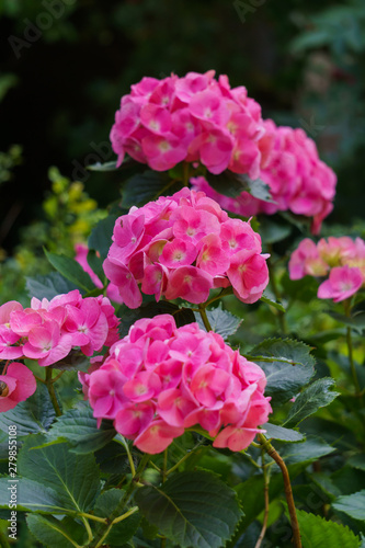 Inflorescence of bright pink hydrangea flowers in the garden.