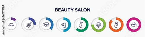 infographic element with beauty salon outline icons. included big moustache, beauty salon chair, woman eye, after shave, liquid soap, beauty face mask, french perfume, woman lips vector.