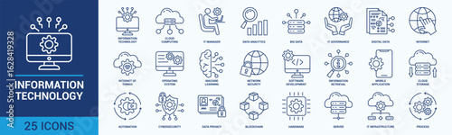 Information Technology icon set. Containing cloud computing, IT manager, big data, data analytics, internet, network security and more. Outline vector icons collection.