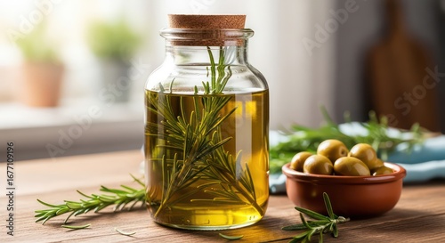 Infused olive oil with rosemary sprigs in a glass bottle, next to a bowl of green olives