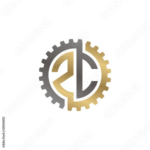Initial letter Z and C, ZC, interlock cogwheel gear logo, black gold on white background