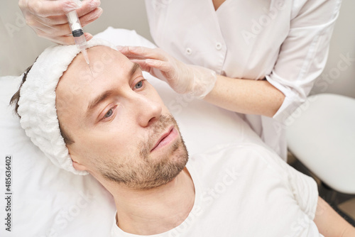 Injection at spa salon. Doctor hands in gloves. Closeup. Pretty male patient. Beauty treatment. Healthy skin procedure. Young man face. Plasmolifting rejuvenation
