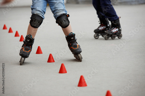 inline skates moving through a skatepark. freestyle slalom