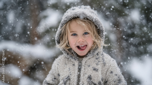 Innocent child in fluffy hooded coat, face lit with delight, tongue out catching gentle snowfall, blurred snowy forest behind