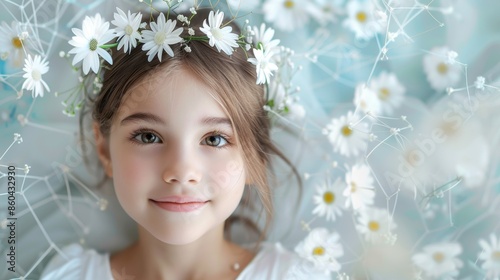 children, girl, floral, daisy, spring, nature, innocence, happy, smile, youth, beauty, summer, portrait, childhood, purity, joy, carefree, dreamy, gentle, peaceful, serene, soft, halo, headband, white flower, natural, sweet, cute, whimsical, greenery, season, lovely, delicate, aethereal, glowing, bright, tender, charme, positivity, playful, fresh, feminine, happiness, candid, youthfulness