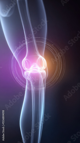 Innovative Medical Illustration: Human Knee Joint Connected by Ethereal White Circles on Dark Gradient Background. Abstract Commercial Design for Healthcare, Rehabilitation Centers, and Medical Examin