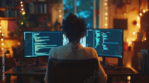 programmer, coding, computer, technology, workspace, office, night, light, screen, datum, work, creative, focused, information, developer, programming, environment, modern, ambience, concentration, remote, laptop, cosy, soft, inspired, artistic, digital, innovation, design, software, online, productivity, learning, tech, home office, multitask, interface, computer science, monitor, visual, serene, atmosphere