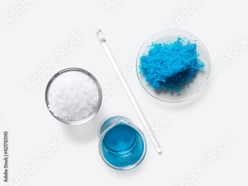 Inorganic chemical placed next to the Stirring Rod on white laboratory table. Copper(II) sulfate, Microcrystalline wax, alcohol. Chemical ingredient for Cosmetics and Toiletries product. Top View