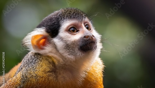 Inquisitive Common Squirrel Monkey Gazing Upwards Towards the Azure Costa Rican Canopy, Capturing a Moment of Wonder and Curiosity in the Tropical Rainforest.