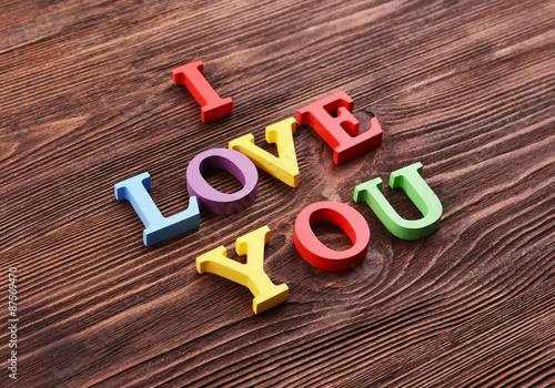 Inscription I LOVE YOU made of colorful letters on wooden background