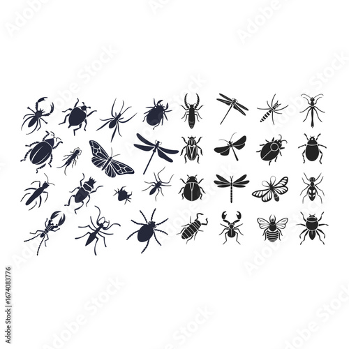 Insect Silhouette Icon Set with Bugs, Beetles, and Dragonflies Collection