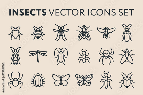 Insect Vector Flat Line Icon Illustration Set. Bed Bug, Fly, Dragonfly, Ant, Roach, Cockroach, Mosquito, Termite, Spider, Butterfly, Bee, Wasp.