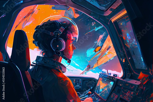 spaceship, pilot, space, universe, computer, technology, design, speed, motion, art, gouache, painting, cartoon, flying, flying saucer, colours, digital