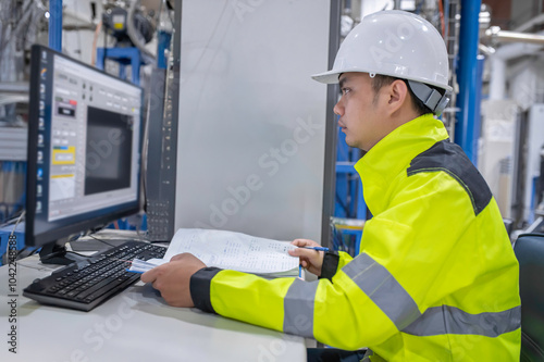 Inside the large Industry Factory Female Computer Engineer Works on Personal Computer She coding program for control machine,Thailand people work on fours monitors,Programmer working with serious