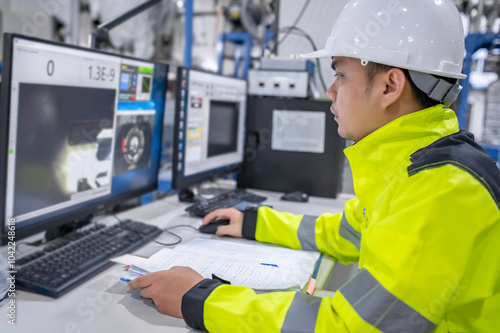 Inside the large Industry Factory Female Computer Engineer Works on Personal Computer She coding program for control machine,Thailand people work on fours monitors,Programmer working with serious