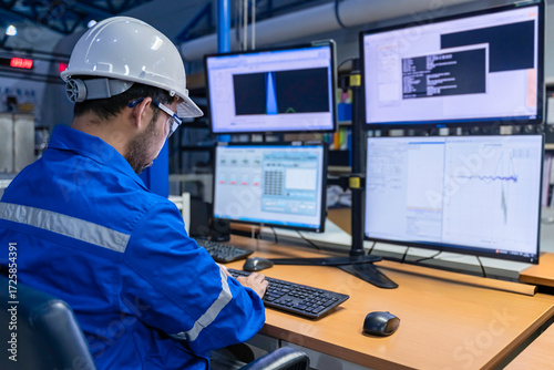 Inside the large Industry Factory male Computer Engineer Works on Personal Computer She coding program for control machine,Thailand people work on fours monitors,Programmer working with serious