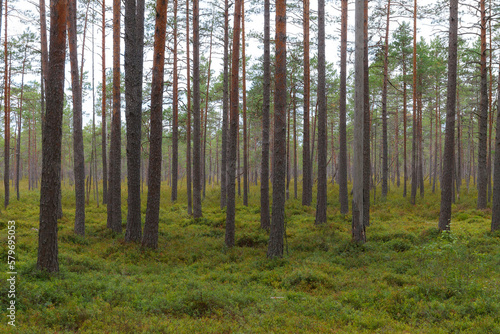Inside the pine forest. Tree trunks, small trees and moody weather